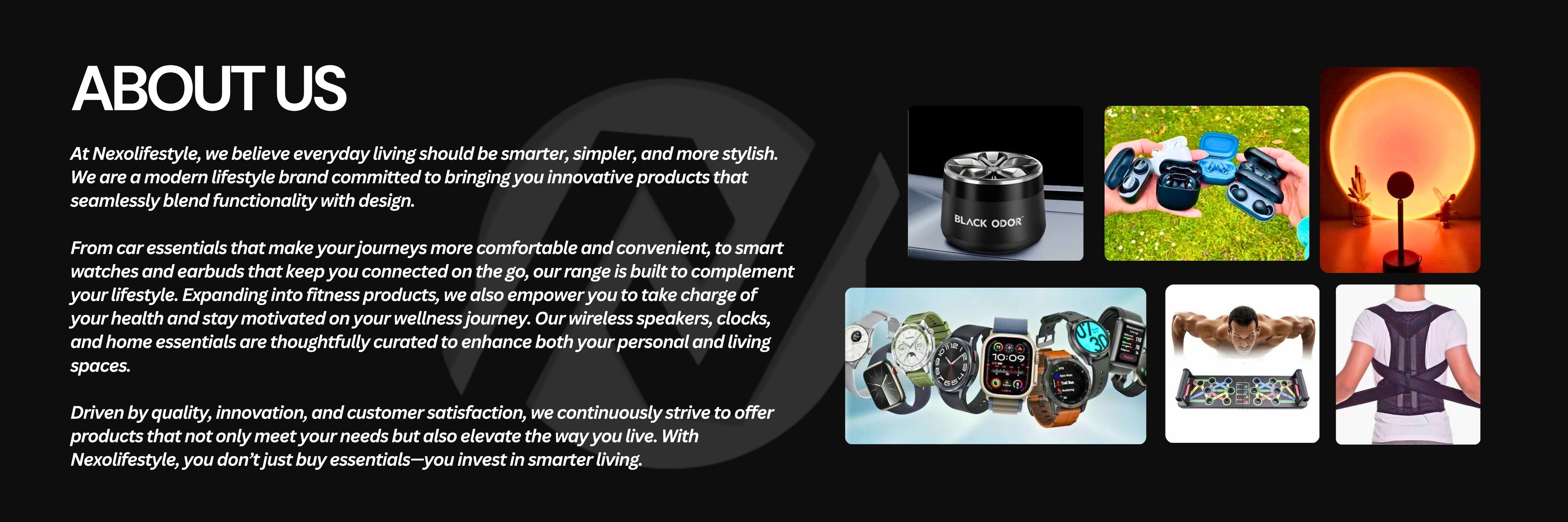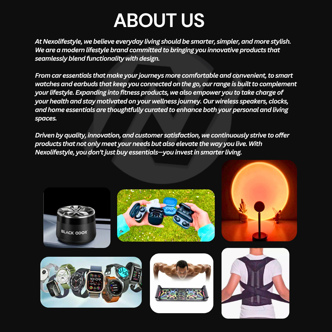 From smartwatches to earbuds and fitness essentials, every product at NexoLifestyle is designed with purpose — to keep you connected, motivated, and ahead of the curve. Our goal is to bring you technology and style that elevate your everyday without compromising on quality, comfort, or individuality.
